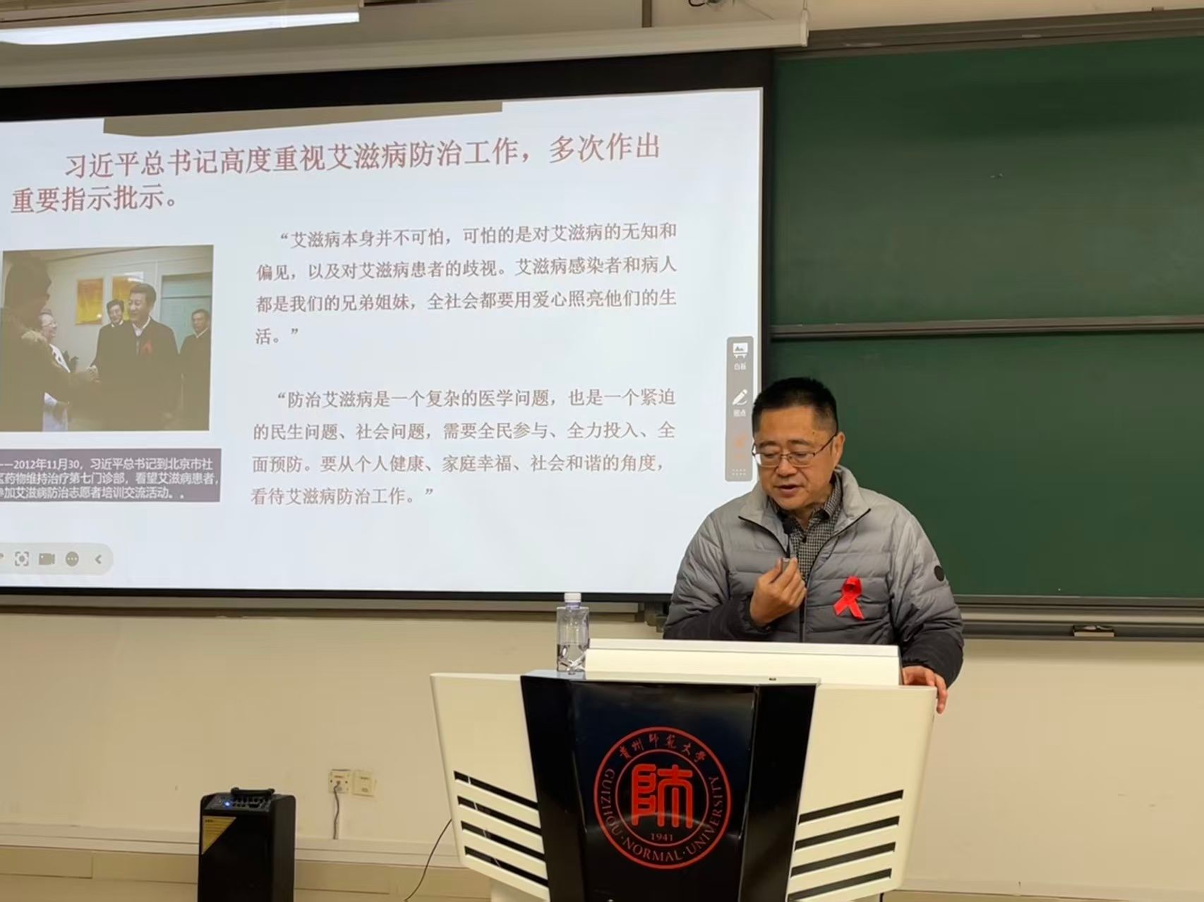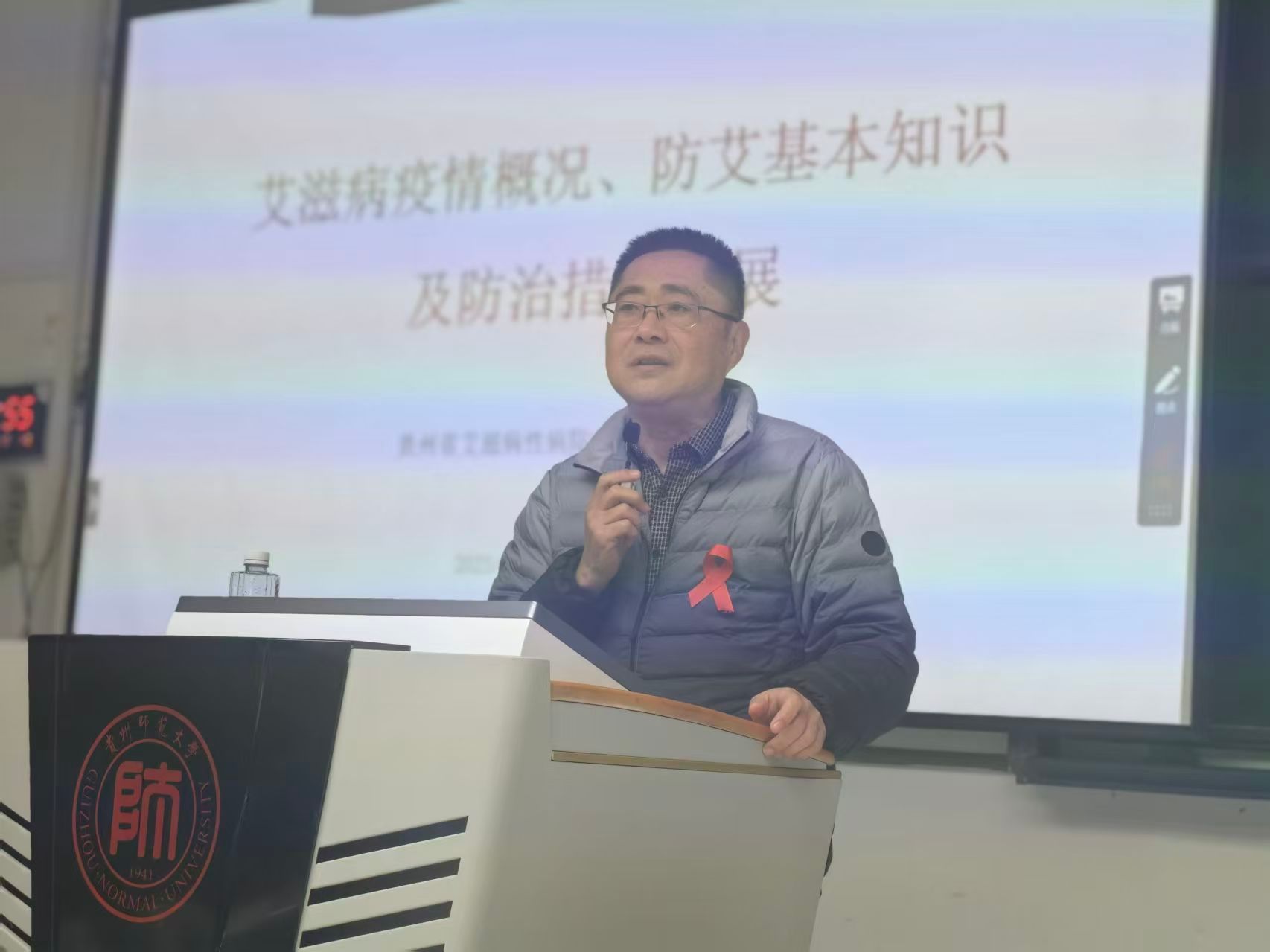 讲座伊始,姚永明结合全球艾滋病疫情,从患病人数、高发人群、治疗目标三个方面向听众传达了艾滋病依然是全球挑战的思想,他结合全国及贵州省近年艾滋病感染数据,客观分析了当前艾滋病传染防控的严峻形势,明确校园是人群密集场所的防护重点。
